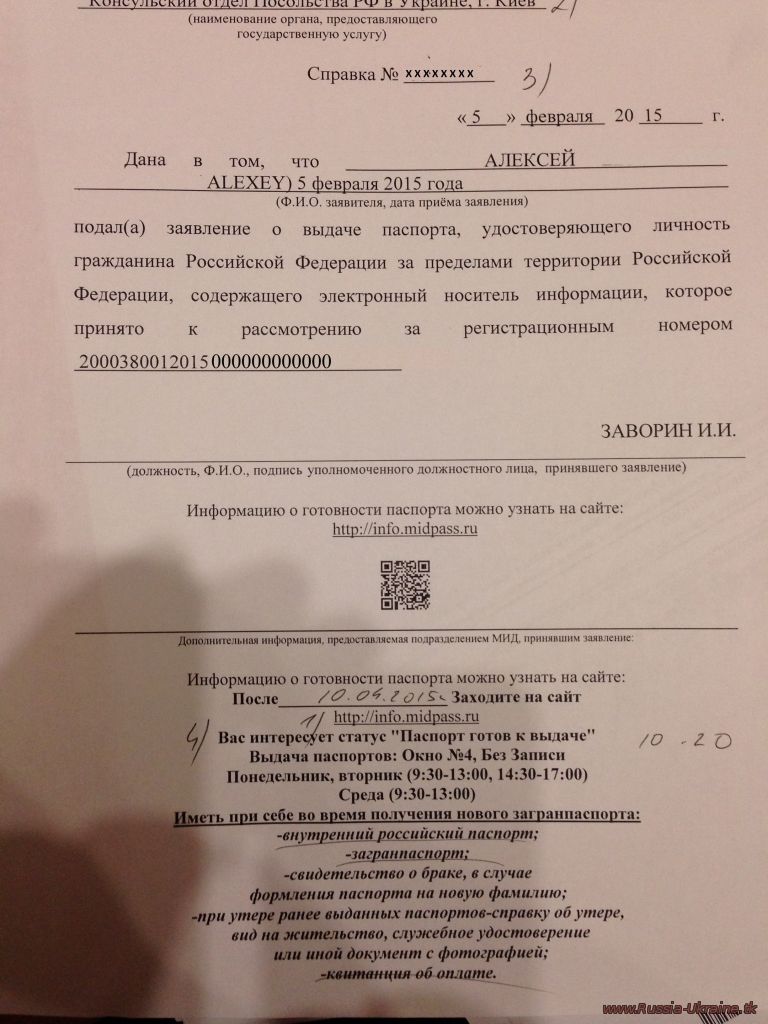 | Всем привет... всех обманул-извините.... Я подавался как раз 5 фквраля... в 15.30 очередь была но зашел в 15 так по моему... вобщем после подачи документов мне дали справку, и квиток из кассы об оплате... Вот на справке есть номер справки с которым нужно обращаться на сайт.... Сайт такой.... http://info.midpass.ru 2) выбираем консульский отдел пос. РФ в Украине г. Киев... 3) вводим номер справки он 8-ми значный на скане закрашенный 4) смотрим когда появиться статус "паспорт готов к выдаче" Еще раз сорри что ввел в заблуждение... Смотрим скан.....