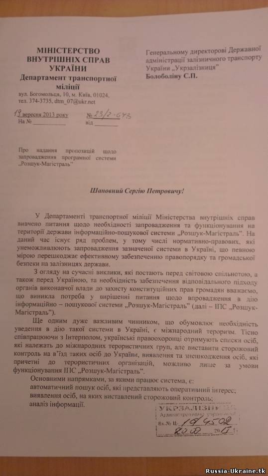 В документе отмечено, что отечественные милиционеры хотят в своей работе воспользоваться опытом России и Белоруссии, и вносить данные из проездных документов всех пассажиров в специализированную поисковую систему. Проведение таких действий они мотивируют необходимостью защиты украинцев от международного терроризма и желанием осуществлять автоматический поиск лиц, представляющих оперативный интерес.