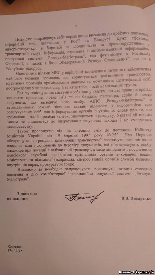 | Министерство внутренних дел Украины настойчиво предлагает Укрзалізниці вносить в билет пассажира кроме ФИО еще паспортные данные. С таким письмом обратился к этому государственному предприятию Начальник департамента транспортной милиции.