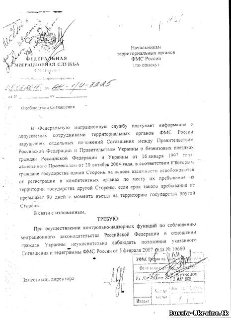 (сотрудники ФМС должны проверять постановку на учет по электронной базе). Но на практике пограничники (вне рамок своей компетенции) требуют предъявить КСЕРОКС (комедия) отрывной части (предъявление ксерокса, естественно, не предусмотрено никакими законами, хотя ФМС рекомендует его иметь, но это скорее свидетельство беспомощности росс. орагнов по причине абсолютно непродуманного миграц. законродательства) или ЗАПИСЬ органа ФМС на миграционной карте о потсановке на миграц. учет (что грубо противоречит закону, т.к. на миграц. карте не должно быть посторонних записей, однако бывает, что орган ФМС делает такую запись, если иностранец подал уведомление о прибытии непосредственно в орган ФМС, а не по почте.). И если иностранец не предъявяляет ни ксерокс ни миграц. карту с записью органа ФМС, в том числе граждане Украины - следуют угрозы, на которые не каждый в состоянии адекватно ответить, и запуганные послушно платят взятку. которая и является целью незаконных "проверок"